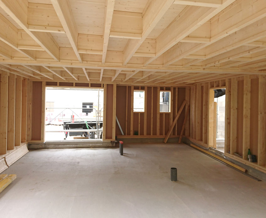 Le plafond est composé de solives bois industrielles recouvertes d’un panneau multicouche en bois.